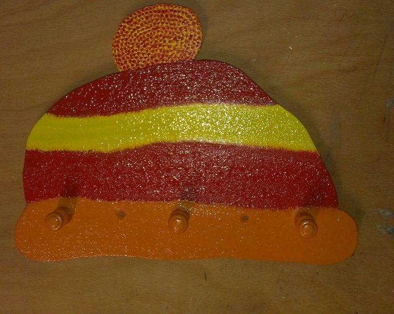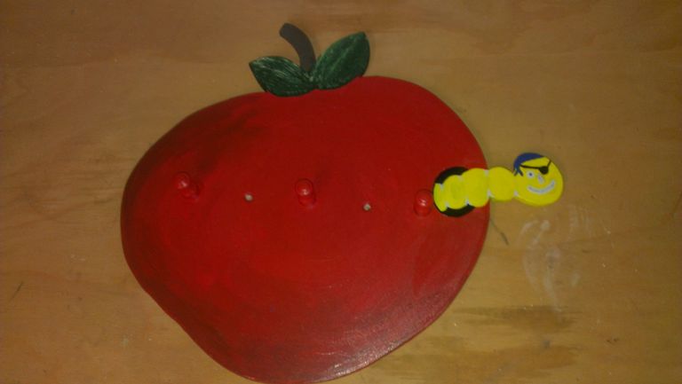 Eine kleine Kindergarderobe aus Holz mit 3 Haken. Als Motiv habe ich hier ein Apfel gewählt aus dem gerade ein kleiner Wurm heraus kriecht. Auch hier befindet sich natürlich auf der Rückseite ein Abstandsplatte, damit der Apfel nicht direkt an der Wand befestigt wird.