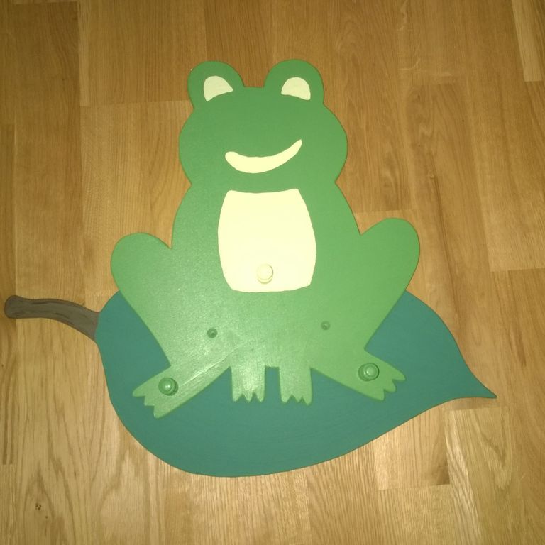 Eine kleine Kindergarderobe aus Holz mit 3 Haken. Als Motiv habe ich einen ganz einfach dargestellten Frosch auf einem großen Blatt gewählt.