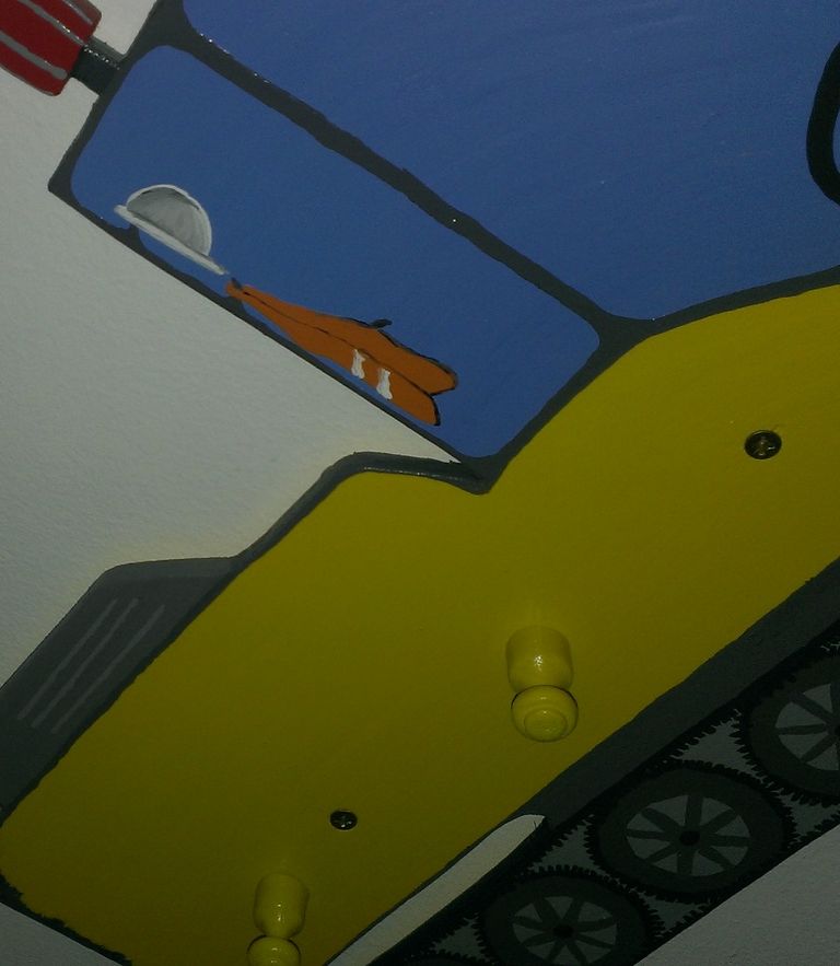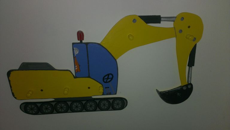 Eine große Kindergarderobe aus Holz mit 6 Haken. Als Motiv habe ich hier ein schöner gelber Bagger gewählt. Auf der Rückseite befinden sich kleine Abstandplatten, damit die Garderobe nicht direkt an der Wand befestigt werden muss.