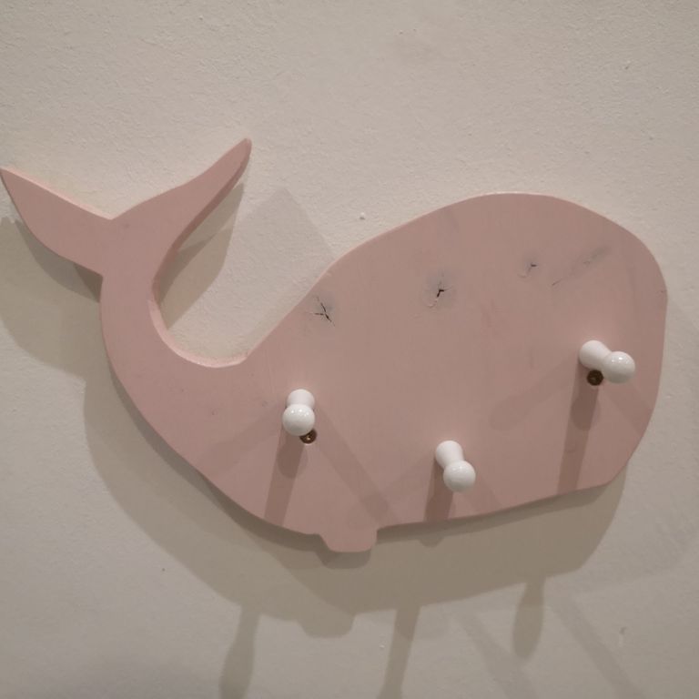 Eine kleine Kindergarderobe aus Holz mit 3 große Haken. Das Motiv ist hier ein niedlicher kleiner Pottwal. Auch bei dieser Garderobe befindet sich auf der Rückseite eine klein Abstandsplatte, damit der Wal nicht direkt an der Wand befestigt wird und es dadurch optisch schöner wird.