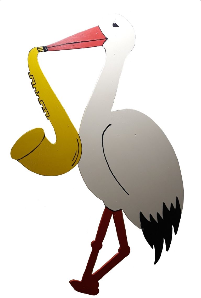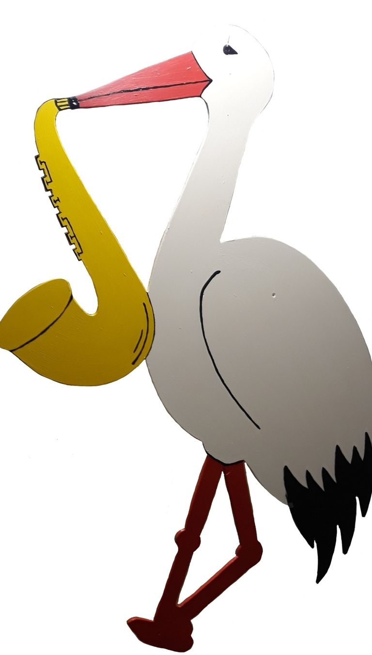 Hier ein stehender Storch. Als individueller Zusatz spielt der Storch auf einem Saxophon.