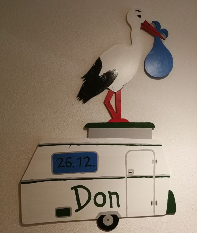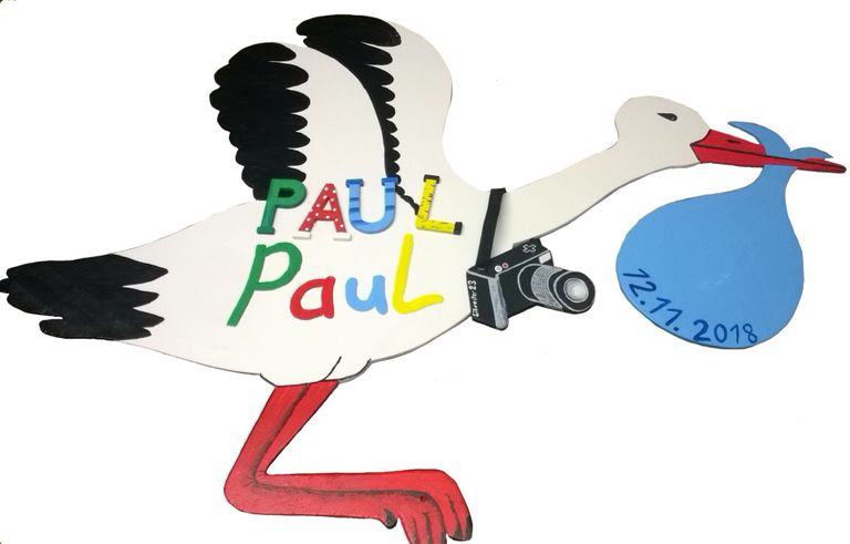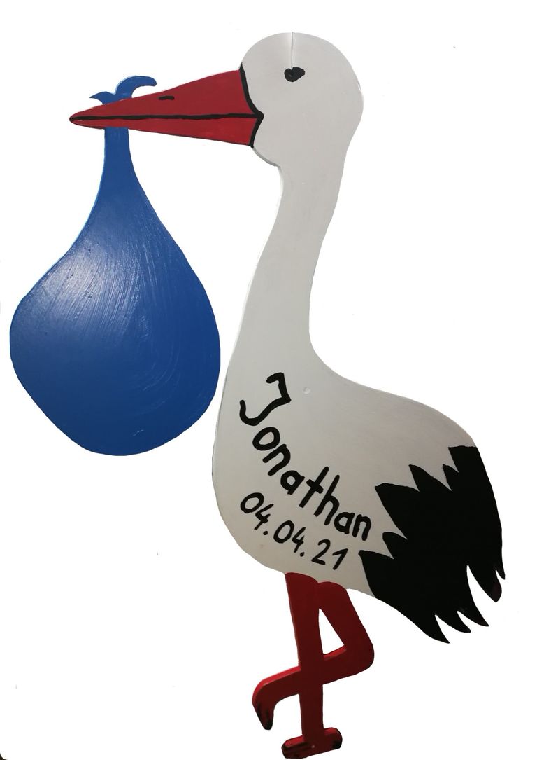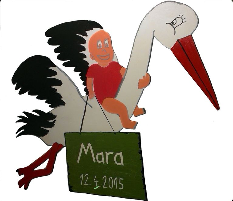 Auch hier wieder ein fliegender Storch. Dieses Mal sitzt ein kleines Baby darauf, dass ein Schild trägt mit dem Namen.