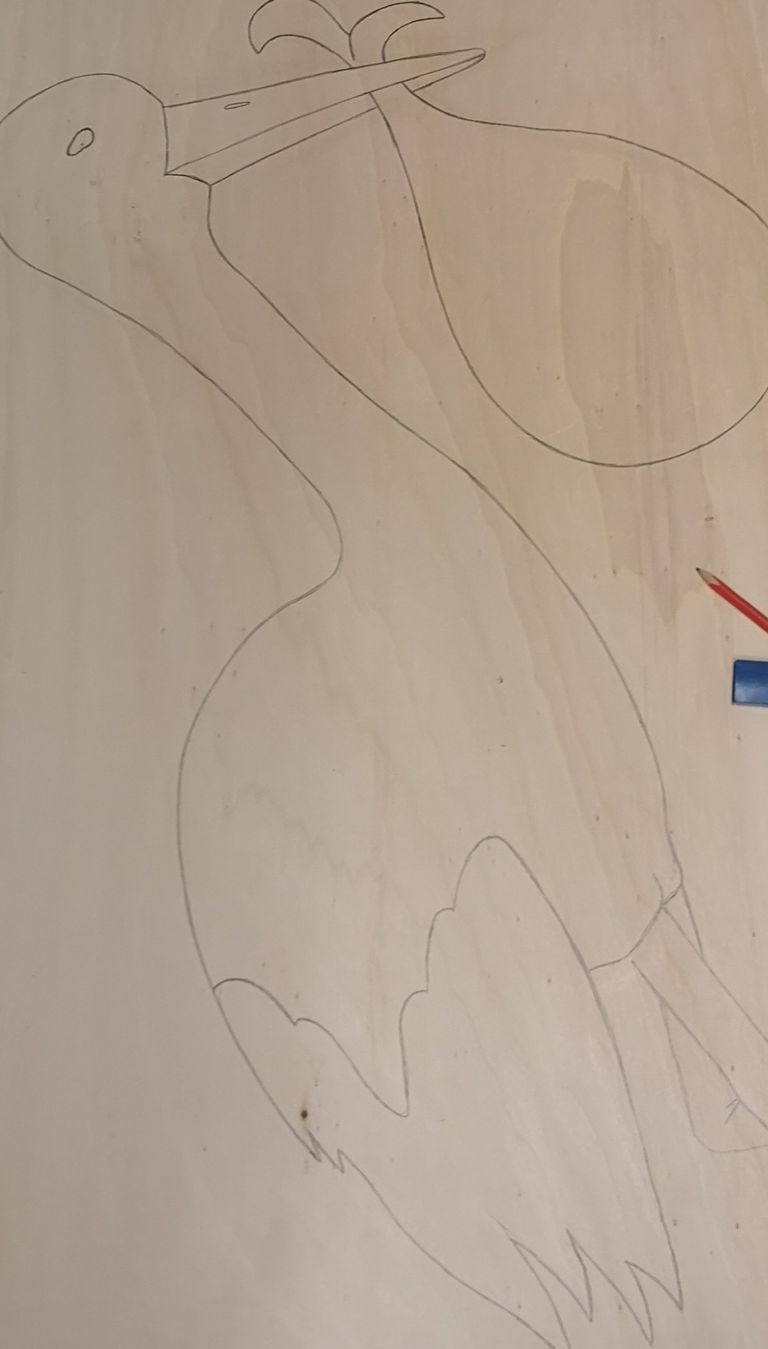 Tipp: Mach keine ganz genaue oder kleine Details darauf. Erstens ist dies viel schwieriger mit der Säge auszusägen (es bricht und reißt schnell). Und zweitens ist es bei der Montage, vor allem wenn der Storch draußen aufgestellt werden sollte, dem Wind ausgesetzt und der kann dann deinen liebevollgemachten Storch abbrechen und kaputt machen.
